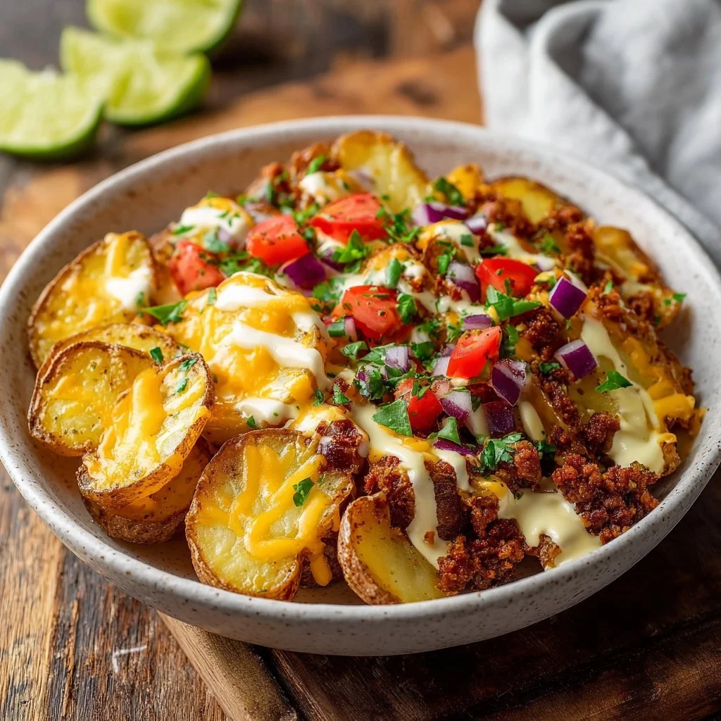 - Layer colors: Start with the crisp potatoes, add a darker protein layer, then finish with bright toppings (salsa, tomatoes, cilantro) so each bowl looks vibrant.